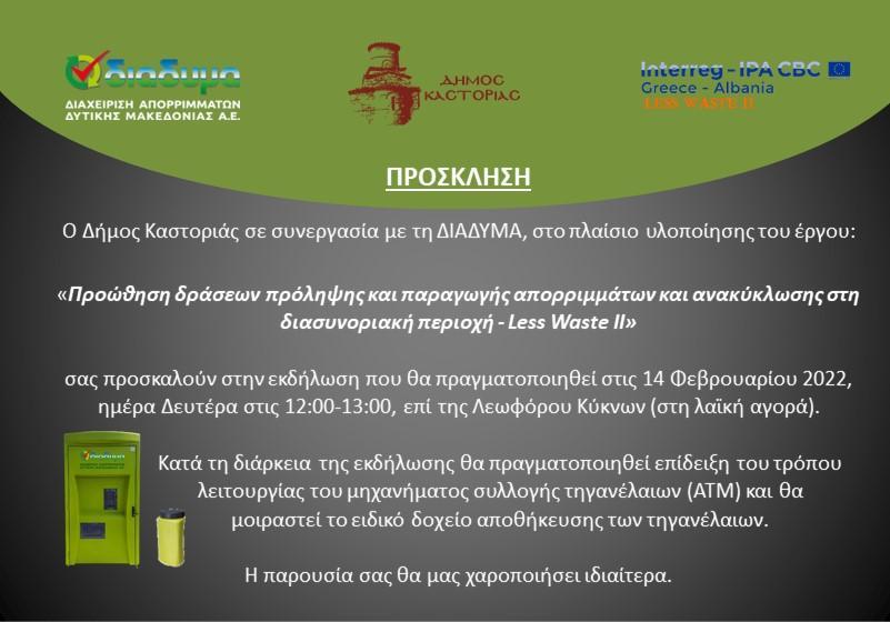 Ο Δήμος Καστοριάς και η ΔΙΑΔΥΜΑ Α.Ε. στο πλαίσιο υλοποίησης του έργου: «Προώθηση δράσεων πρόληψης και παραγωγής απορριμμάτων και ανακύκλωσης στη διασυνοριακή περιοχή – Less Waste II» προωθεί ένα νέο, καινοτόμο, σύστημα χωριστής συλλογής τηγανελαίων από νοικοκυριά.