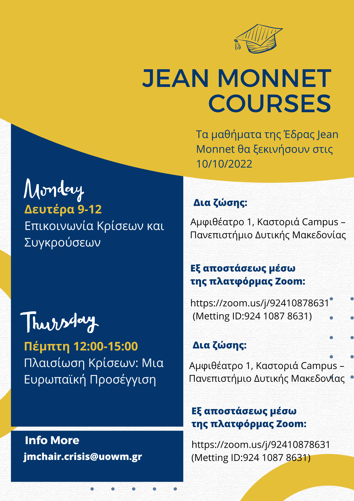 Για περισσότερες πληροφορίες σχετικά με την Έδρα Jean Monnet και τη συμμετοχή στα μαθήματα επικοινωνήστε με email ή επισκεφθείτε την ιστοσελίδα και τα social media της Έδρας.