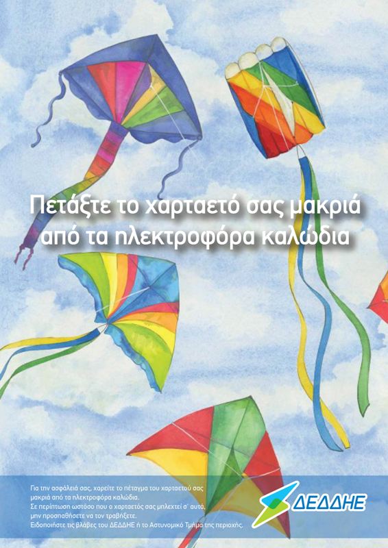 Ο Διαχειριστής Ελληνικού Δικτύου Διανομής Ηλεκτρικής Ενέργειας (ΔΕΔΔΗΕ) σας συμβουλεύει να μην πετάτε το χαρταετό σας κοντό σε ηλεκτροφόρα καλώδια, καθώς υπάρχει σοβαρός κίνδυνος ηλεκτροπληξίας για εσάς και διακοπής της παροχής ρεύματος στη γύρω περιοχή.