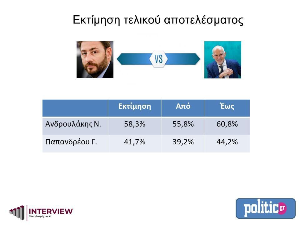 Τέλος τη δική της αξία έχει και η κάρτα με την εκτίμηση του τελικού αποτελέσματος με το αντίστοιχο περιθώριο σφάλματος. Σύμφωνα με την έρευνα, το ποσοστό του Ν. Ανδρουλάκη κυμαίνεται από 55,8% έως 60.8%, ενώ αυτό του Γ. Παπανδρέου από 39.2% έως 44.2%.