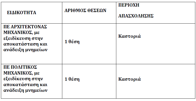 Η Εφορεία Αρχαιοτήτων Καστοριάς ανακοινώνει την πρόσληψη επιστημονικού προσωπικού, με σύμβαση εργασίας ιδιωτικού δικαίου ορισμένου χρόνου, για την εκτέλεση των αρχαιολογικών εργασιών για χρονικό διάστημα τριών (3) μηνών από την ημερομηνία υπογραφής της σύμβασης, με δυνατότητα ανανέωσης ή παράτασης της σύμβασης έως το τέλος των εργασιών που εκτελούνται με τη μέθοδο της Αρχαιολογικής Αυτεπιστασίας από την ΕΦΑ Καστοριάς για το έργο με ακρωνύμιο «TACTICAL TOURISM» του Ε.Π. Ευρωπαϊκής Εδαφικής Συνεργασίας Interreg IPA «Ελλάδα – Αλβανία 2014-2020».