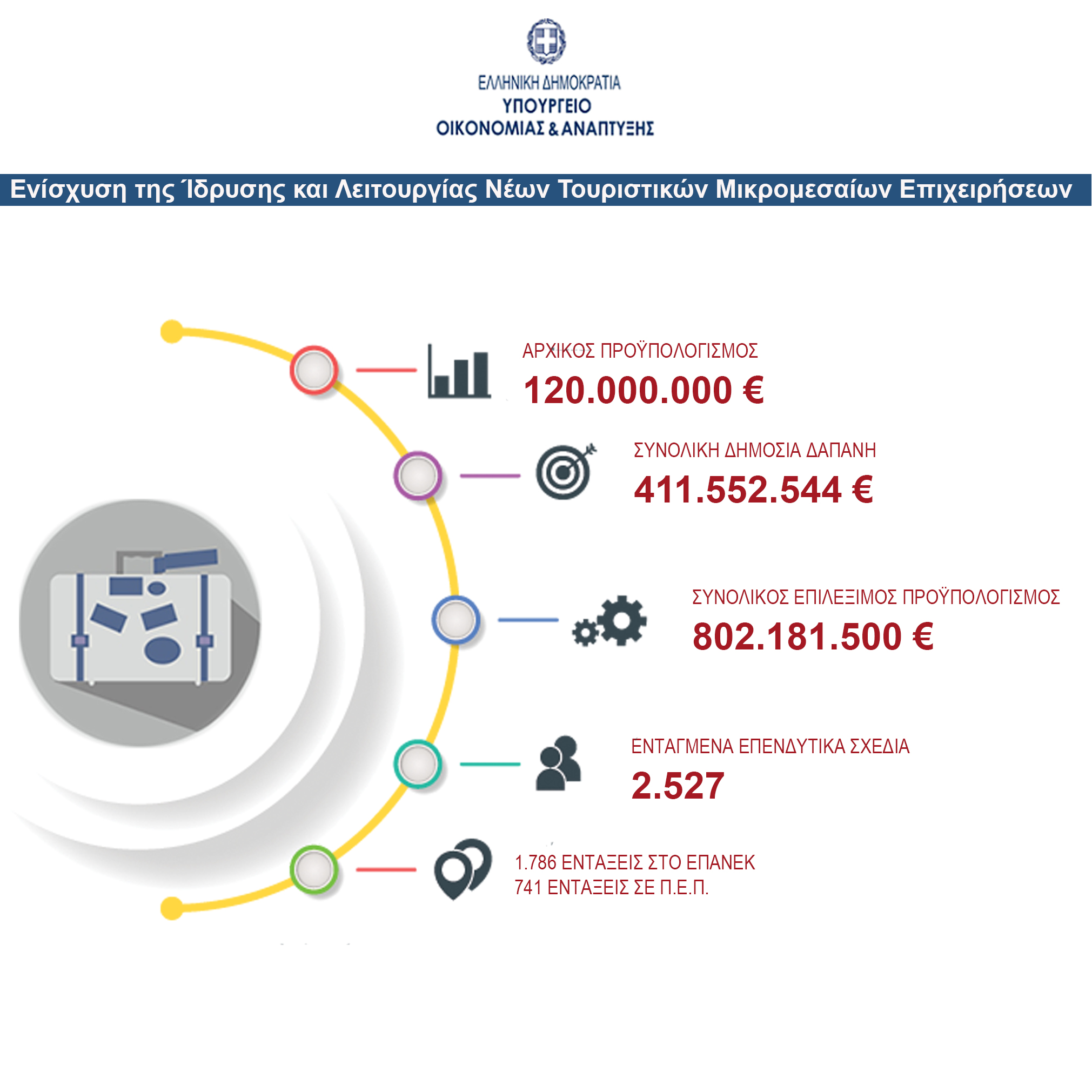 Το Υπουργείο Οικονομίας και Ανάπτυξης ανακοινώνει την ολοκλήρωση της διαδικασία αξιολόγησης των 7.297 επενδυτικών σχεδίων που υποβλήθηκαν στην δράση «Ενίσχυση της Ίδρυσης και Λειτουργίας Νέων Τουριστικών Μικρομεσαίων Επιχειρήσεων». Η υψηλή επενδυτική ζήτηση και η ανάγκη να υποστηριχτούν όσον το δυνατόν περισσότερα βιώσιμα και ποιοτικά επενδυτικά σχέδια οδήγησε στην απόφαση για αύξηση της διαθέσιμης δημόσιας χρηματοδότησης, όπως έχει ήδη ανακοινωθεί από το Σεπτέμβριο.