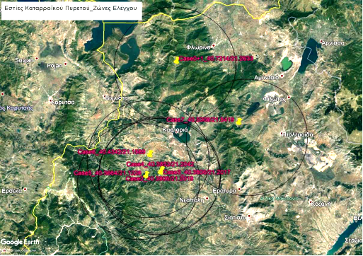 Εικόνα 1. Εστίες Κ.Π. στις Π.Ε. Καστοριάς και Κοζάνης και απεικόνιση Ζωνών Ελέγχου ακτίνας 20 χιλιομέτρων