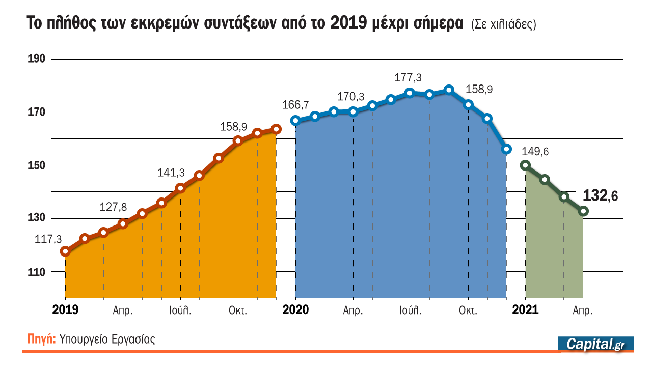 Έτσι, τον Απρίλιο 2021 το πλήθος τους ανήλθε σε 132.605 συγκριτικά με 137.915 που ήταν τον Μάρτιο του 2021 και 170.280 έναν χρόνο πριν. Με άλλα λόγια, οι εκκρεμείς συντάξεις μειώθηκαν τόσο από μήνα σε μήνα (τον Απρίλιο σε σχέση με το Μάρτιο 2021), όσο και από έτος σε έτος (τον Απρίλιο του 2021 σε σχέση με τον Απρίλιο του 2020).