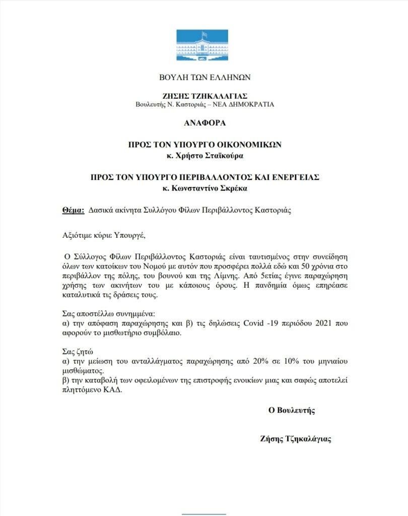Αναφορά Βουλευτή Ζήση Τζηκαλάγια για διευκόλυνση στην λειτουργία του Συλλόγου Φίλων Περιβάλλοντος Καστοριάς.