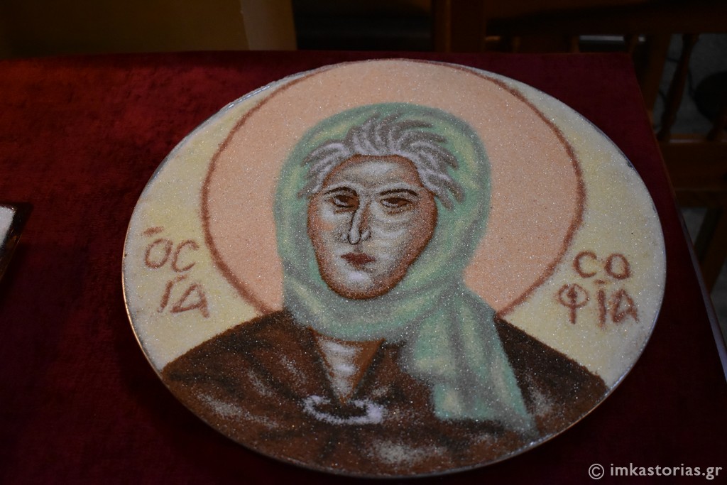 Στον Εσπερινό της 7ης Ιουλίου χοροστάτησε ο Σεβασμιώτατος Μητροπολίτης Σισανίου και Σιατίστης κ. Αθανάσιος, συμπροσευχόμενος στάθηκε ο επιχώριος Επίσκοπος, ενώ πλήθος Κληρικών και λαϊκών προσήλθαν προσευχητικά στην κατανυκτική αυτή ακολουθία. Μετά την Αρτοκλασία, τον θείο λόγο κήρυξε ο Μητροπολίτης Καστορίας αναφερόμενος στη φράση του Αποστόλου Ματθαίου : «ομοία εστίν η βασιλεία των ουρανών ανθρώπω εμπόρω ζητούντι καλούς μαργαρίτας». Συμπλήρωσε το παράδειγμα του Αποστόλου με τις ρήσεις δύο μεγάλων Πατέρων της Εκκλησίας, του Μεγάλου Βασιλείου («πάντες οι την ευαγγελικήν οδόν πορευόμενοι έμποροι εσμέν») και του Αγίου Γρηγορίου του Θεολόγου («εβουλήθην γενέσθαι τις μεγαλέμπορος»). Σημείωσε δε χαρακτηριστικά ότι η Οσία Σοφία αγόρασε την Βασιλεία των Ουρανών από αυτήν ήδη την ζωή με τον τρόπο ζωής, με την άσκηση και τις αρετές της, αλλά κυρίως με την άρνηση του θελήματός της το οποίο το παρέδωσε εξ ολοκλήρου στον Θεό.