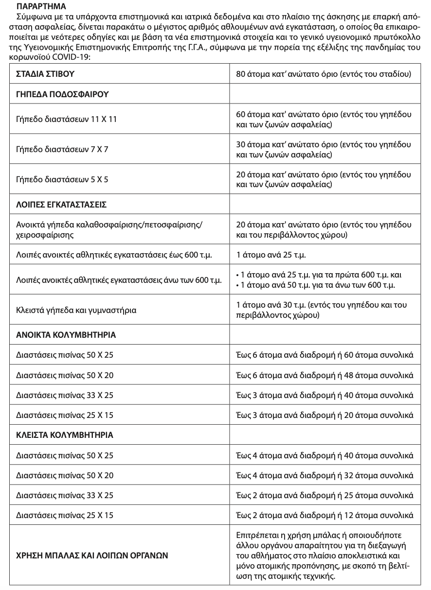 α) Η λειτουργία όλων των ανοικτών αθλητικών εγκαταστάσεων και κολυμβητηρίων και η χρήση τους αποκλειστικά και μόνον για την κάλυψη αναγκών προπόνησης (μόνο με ατομικές προπονήσεις, χωρίς επαφές ή ομαδική άσκηση) από αθλητές σωματείων, Τμημάτων Αμειβομένων Αθλητών (Τ.Α.Α.) και Ανωνύμων Αθλητικών Εταιριών (Α.Α.Ε.) και αθλούμενους ηλικίας δεκατριών (13) ετών και άνω (γεννημένους έως και 31.12.2007) και με τους όρους και τους περιορισμούς που αναφέρονται στο Παράρτημα, το οποίο αποτελεί αναπόσπαστο μέρος της παρούσας. Οι αθλητές όλων των προ-ολυμπιακών και των εθνικών ομάδων κάνουν χρήση των παραπάνω αθλητικών εγκαταστάσεων κατ’ απόλυτη προτεραιότητα.