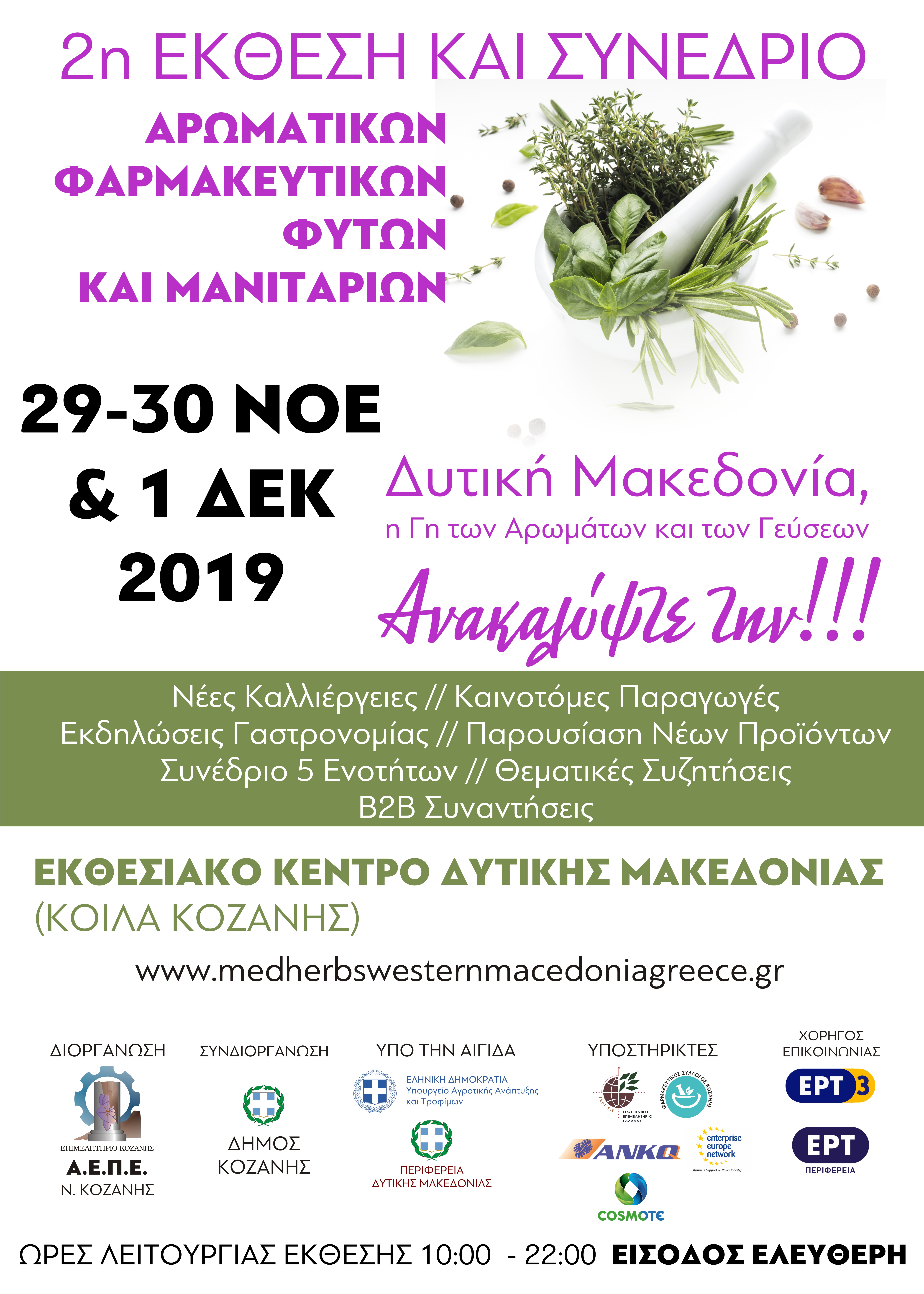 Η Περιφέρεια Δυτικής Μακεδονίας σε συνεργασία με τον Δήμο Κοζάνης και το Ε.Β.Ε Κοζάνης διοργανώνει την 2η Έκθεση – Συνέδριο Αρωματικών, Φαρμακευτικών φυτών και Μανιταριών που θα λάβει χώρα στις 29-30 Νοεμβρίου και 1 Δεκεμβρίου στο εκθεσιακό κέντρο των Κοίλων Κοζάνης. Η έκθεση τελεί υπό την αιγίδα του Υπουργείου Αγροτικής Ανάπτυξης και Τροφίμων και τη συμμετοχή της Γενικής Γραμματείας Εμπορίου και Προστασίας Καταναλωτή.