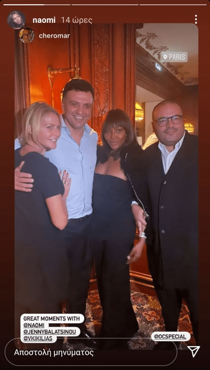Η Ναόμι Κάμπελ ανέβασε μάλιστα story στο instagram με τη φωτογραφία που έβγαλε με τον Βασίλη Κικίλια και τη Τζένη Μπαλατσινού.