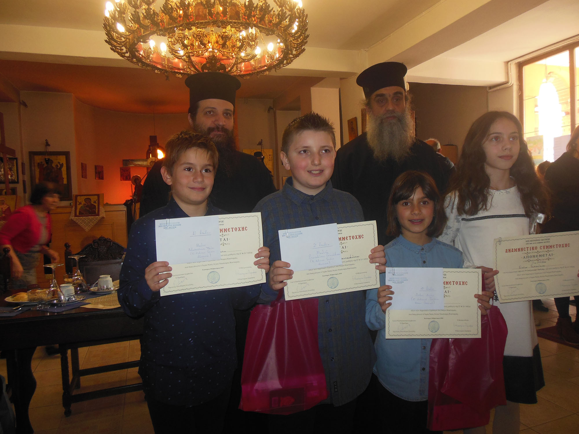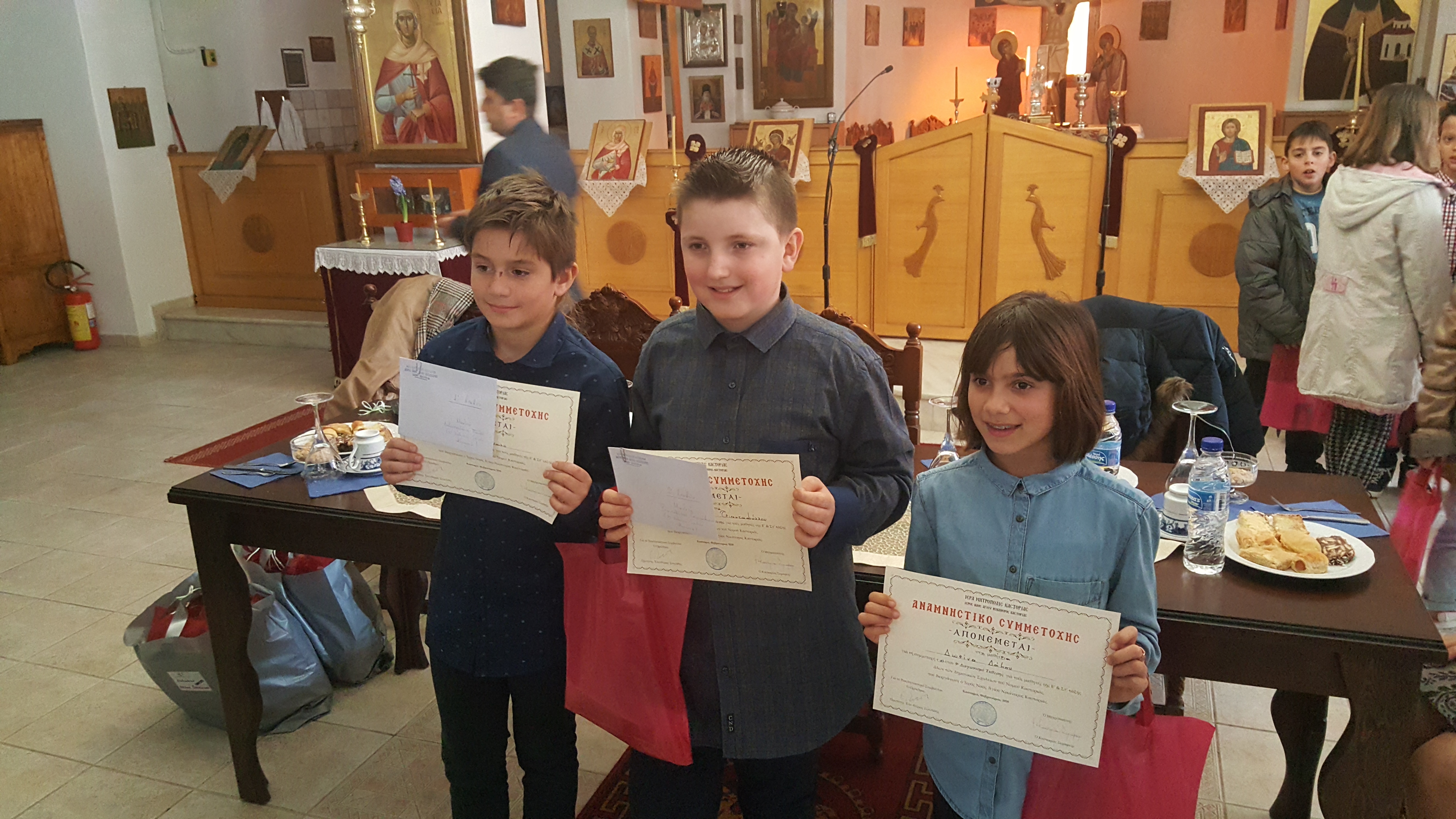 Την Κυριακή 4 Φεβρουαρίου πραγματοποιήθηκε στην αίθουσα δεξιώσεων του Ιερού Ναού Αγίου Νικάνορα, η απονομή των βραβείων στους τέσσερις αριστεύσαντες μαθητές της Ε’ και ΣΤ’ τάξης των Δημοτικών Σχολείων της Π.Ε. Καστοριάς, που συμμετείχαν στο διαγωνισμό συγγραφής έκθεσης που διοργάνωσε για ένατη συνεχομένη χρονιά ο Ι.Ν Αγίου Νικάνορα.