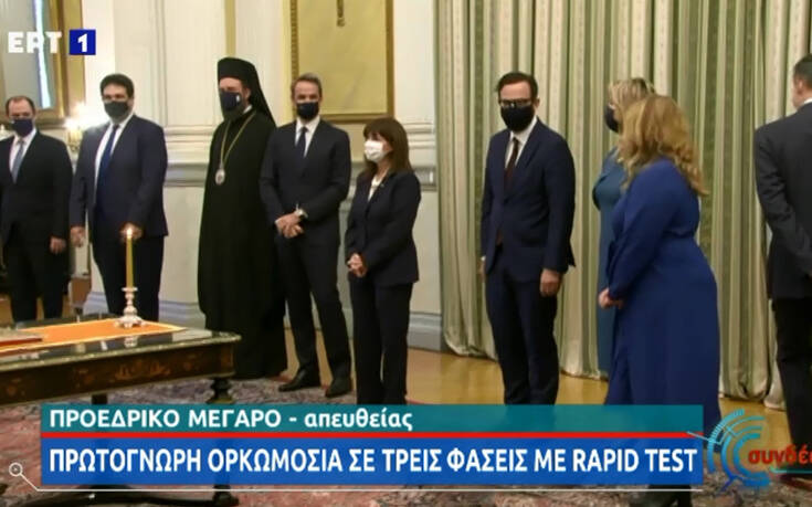 Αυτή η ορκωμοσία ήταν πρωτοφανής, τόσο επειδή οι νέοι υπουργοί και υφυπουργοί χωρίστηκαν σε ομάδες, λόγω των περιοριστικών μέτρων για τον κορονοϊό, όσο κι επειδή προβλεπόταν η διενέργεια rapid test σε όλους, πριν μπουν στο Προεδρικό Μέγαρο.