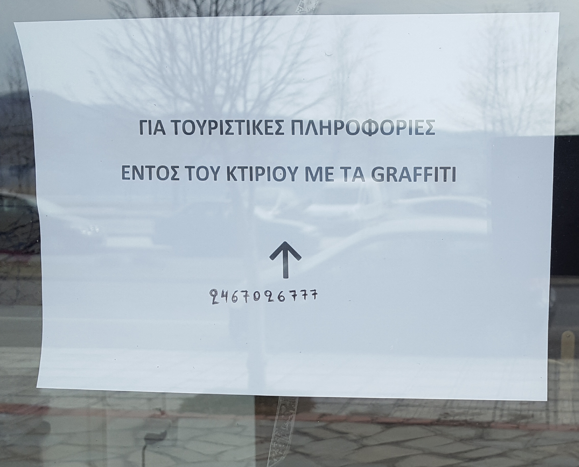 Το τουριστικό περίπτερο έγινε καταφύγιο για τα αδέσποτα. Για άλλη μία φορά κλειστό, με επιγραφή ότι οι τουρίστες μπορούν να εξυπηρετηθούν στο κτίριο με τα γκράφιτι.