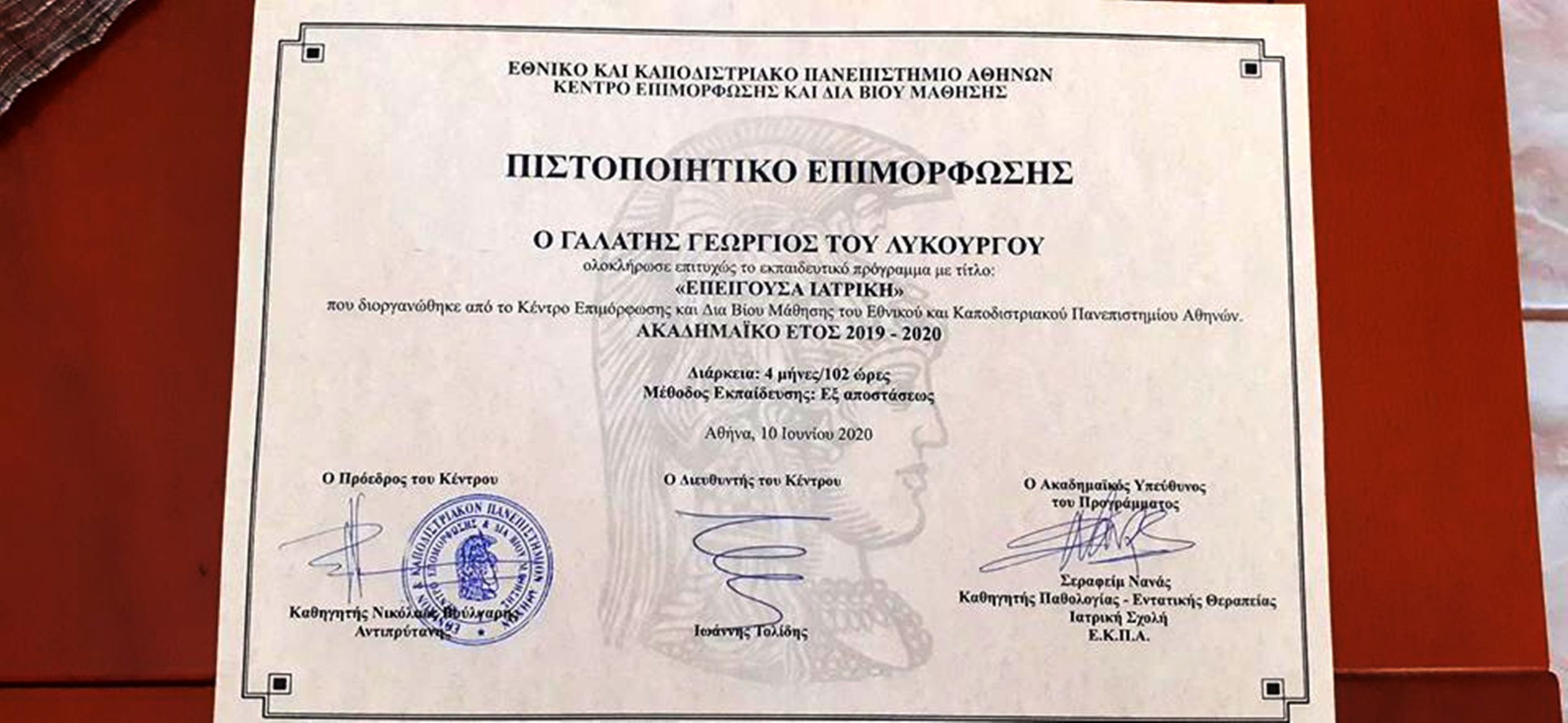 Ο ακούραστος Γιώργος Γαλάτης στο διάστημα από 29 Οκτωβρίου 2019 έως και 23 Μαρτίου 2020 παρακολούθησε επιτυχώς με τη μέθοδο της εξ αποστάσεως εκπαίδευσης και από το Κέντρο Επιμόρφωσης δια Βίου Μάθησης του Εθνικού Καποδιστριακού Πανεπιστημίου Αθηνών το επιμορφωτικό πρόγραμμα με τίτλο «Επείγουσα Ιατρική». Η αναλυτική βαθμολογία μάλιστα είναι η εξής: Βασικές αρχές στην επείγουσα ιατρική 100%, Γενική επείγουσα ιατρική 84% και ειδική επείγουσα ιατρική 97%. Όσο για τη βαθμολογική απόδοση του 84% ο ίδιος λέει ότι ήταν από λάθος που το συνειδητοποίησε λίγα λεπτά μετά την απάντηση που έδωσε αλλά ήταν αργά για να το διορθώσει.