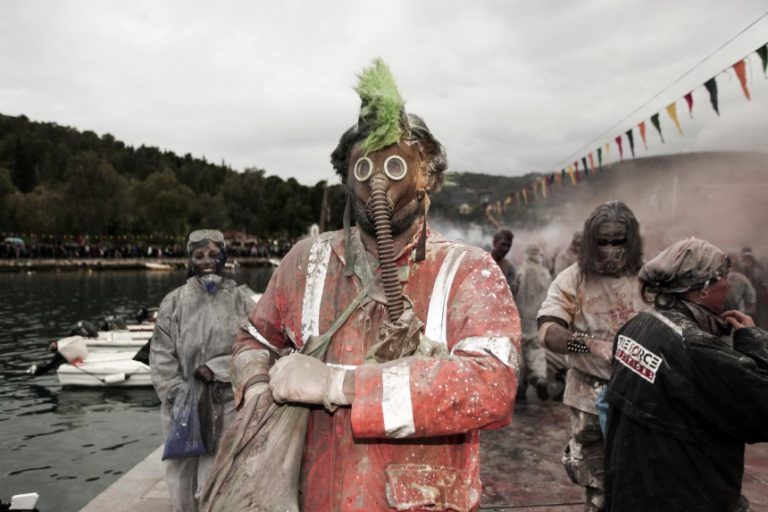Στο Γαλαξίδι στήνουν τα αλευρομουτζουρώματα, ένα «πρωτότυπο» αποκριάτικο έθιμο στο οποίο οι συμμετέχοντας «οπλίζονται» με αλεύρι και φούμο και η πόλη μετατρέπεται σε «εμπόλεμη ζώνη». Μικροί και μεγάλοι ξεκινούν από την «καρδιά» τη πόλης και καταλήγουν στο λιμάνι, παίζοντας αλευροπόλεμο. Ένα σύννεφο καπνού καλύπτει την πόλη, όπου ξεχωρίζουν μόνο οι πολύχρωμες φιγούρες των συμμετεχόντων οι οποίοι αργότερα, ανάβουν φωτιές και χορεύουν. Μάλιστα, τα πρώτα χρόνια έβαφαν το πρόσωπό τους με κάρβουνο και φορούσαν στη ζώνη μεγάλες κουδούνες.