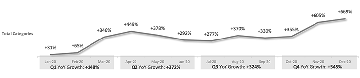 Μελετώντας όλες τις κατηγορίες που αυξήθηκαν σε αξία online αγορών το 2020, παρατηρούμε τις παρακάτω μεταβολές σε σχέση με το 2019: +494% σε κατεψυγμένα τρόφιμα, +446% σε φρέσκα τρόφιμα, +420% σε προϊόντα αρτοποιίας, +397% σε συσκευασμένα τρόφιμα, +363% σε καλλυντικά και είδη περιποίησης, +337% σε ποτά και αναψυκτικά, +302% σε χαρτικά και είδη καθαρισμού, +233% σε προϊόντα για κατοικίδια και +88% σε προϊόντα περιποίησης για παιδιά.