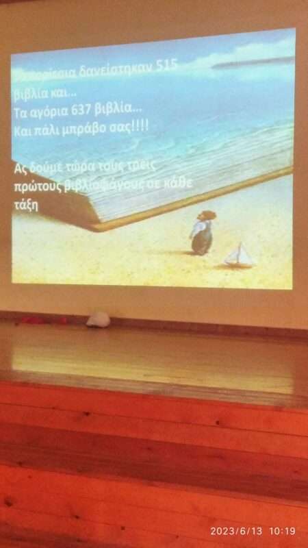 1.152 τίτλοι δανεισμένων βιβλίων είναι ο απολογισμός της Σχολικής μας Βιβλιοθήκης η οποία ολοκλήρωσε τη λειτουργία της για τη φετινή σχολική χρονιά! Παρουσιάστηκαν οι δράσεις της Βιβλιοθήκης μας, βραβεύτηκαν με επαίνους οι δεινοί “βιβλιοφάγοι” και αναδείχθηκαν – ύστερα από κλήρωση – 6 νικητές για τον βιβλιοδανεισμό! Συγχαρητήρια σε όλα τα παιδιά! Η επαφή με το βιβλίο είναι μοναδική!