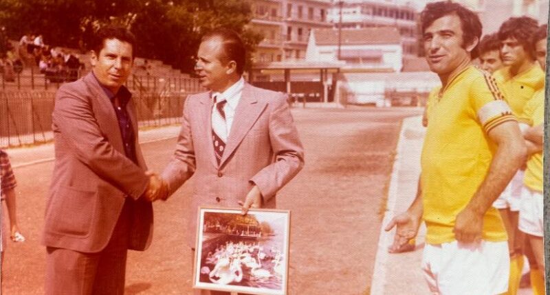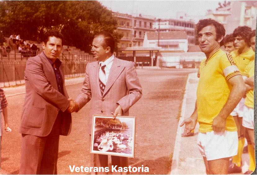 1975 Ο πρόεδρος της Καστοριάς Σωτήρης ΣΙΑΝΟΣ παραλαμβάνει κορνίζα της πόλης από τον αντιδήμαρχο Σωτήρη ΤΟΣΚΟ για την κατάκτηση του πρωταθλήματος 1974.