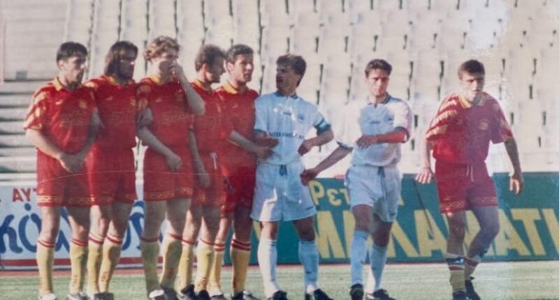 Από αριστερά Μιχάλης ΠΑΝΤΟΠΟΥΛΟΣ-Νίκος ΓΑΤΟΠΟΥΛΟΣ-Παναγιώτης Μητκίδης -Δημήτρης ΖΑΡΟΓΙΑΝΝΗΣ -Λάζαρος ΤΥΡΝΑΣ και δεξιά στην άκρη ο Γιώργος ΤΣΑΓΓΟΠΟΥΛΟΣ, έχοντας στην μέση τον Κριστόφ ΒΑΖΕΧΑ και τον Αλέξη ΑΛΕΞΟΥΔΗ του Παναθηναϊκού.