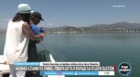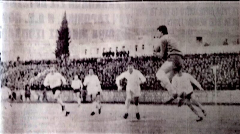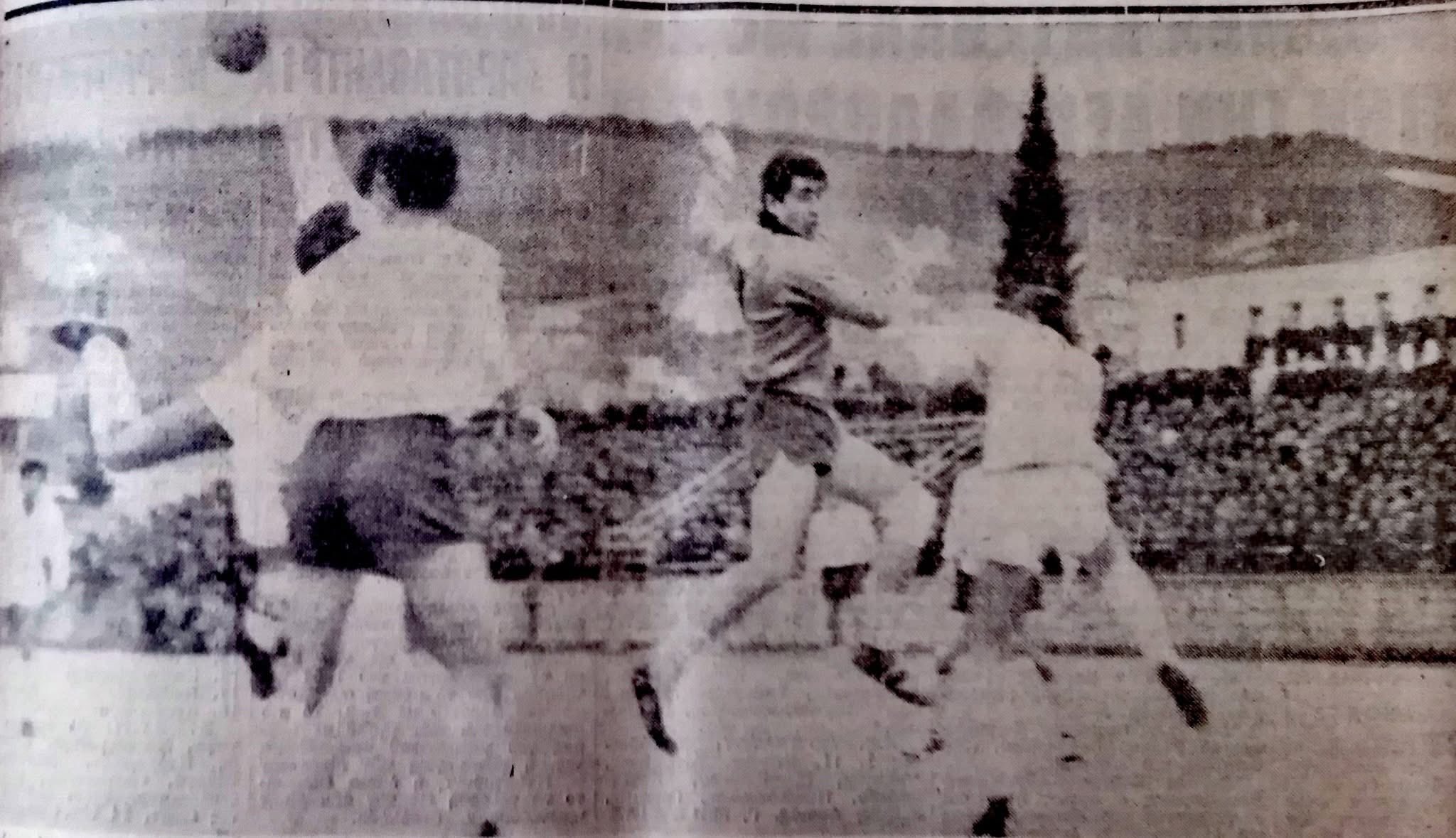 2η φωτογραφία: Ο τερματοφυλακας της Καστοριάς (δεξιά), πηδά και προ του σκόρερ Γιαννελου, αποκρούει θετικά, ενώ διακρίνονται οι Βέλλης (Λ) και εις το βάθος, ο γίγαντας της Καστοριανής αμύνης Τζήμας.
