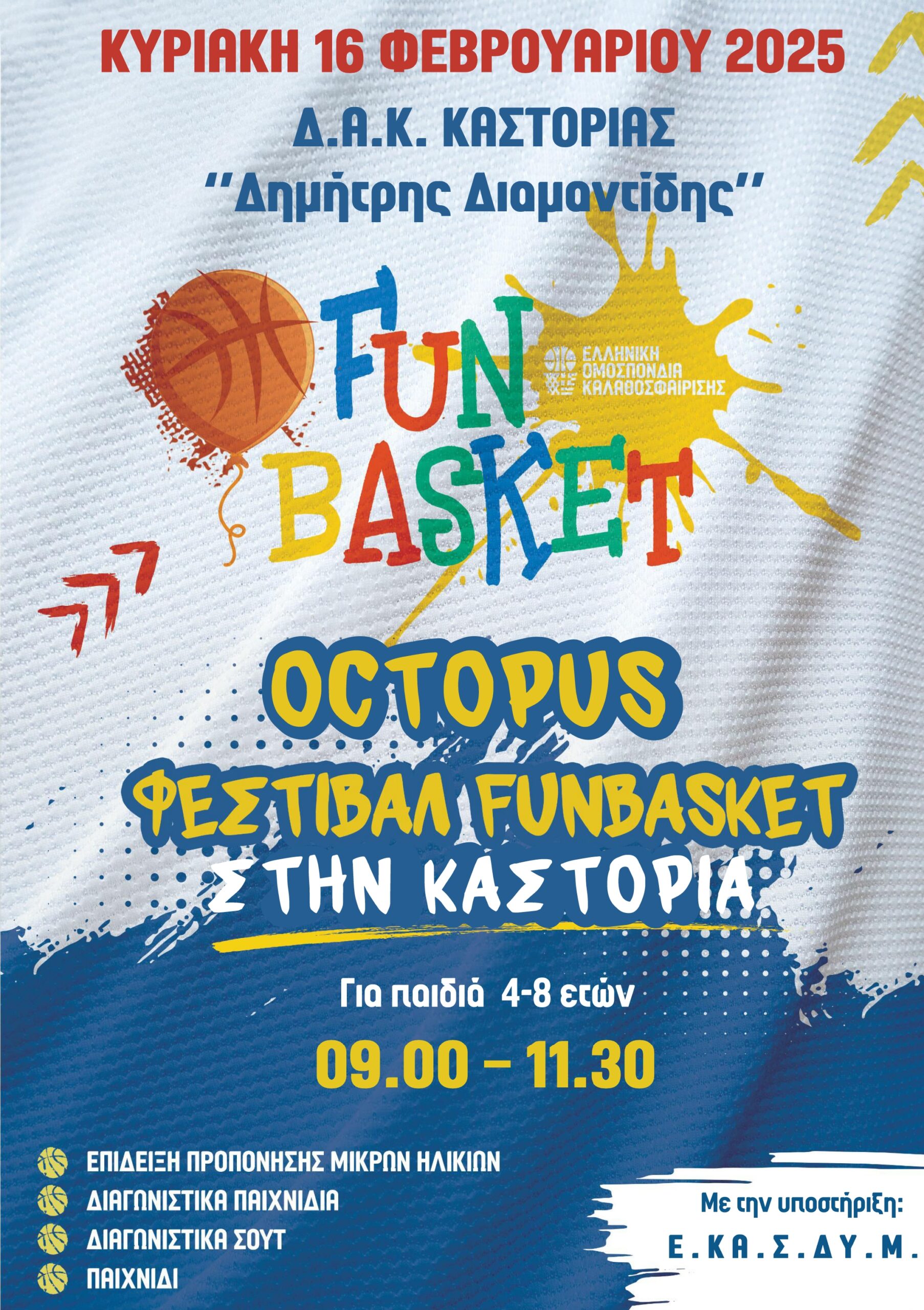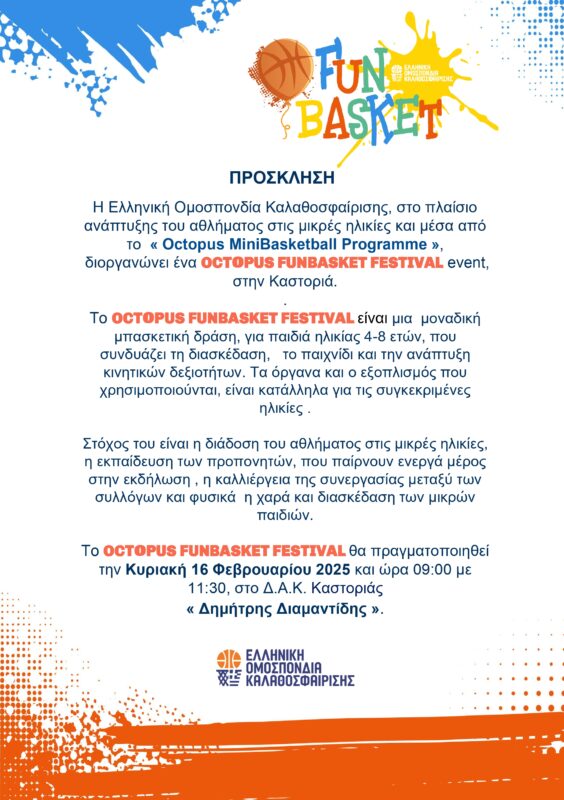 Η Ελληνική Ομοσπονδία Καλαθοσφαίρισης διοργανώνει το Octopus Funbasket Festival, την Κυριακή 16 Φεβρουαρίου 2025 από τις 09:00-11:30, στο κλειστό γυμναστήριο Καστοριάς.