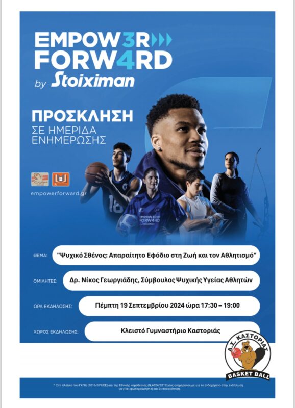 Ο Α.Σ. Καστοριάς σας προσκαλεί στην ημερίδα με θέμα «ψυχικό σθένος: απαραίτητο εφόδιο στη ζωή και τον αθλητισμό» που θα πραγματοποιηθεί την Πέμπτη 19 Σεπτεμβρίου 2024 στις 17:30 στο κλειστό γυμναστήριο Καστοριάς. Ομιλητής θα είναι ο Δρ. Νίκος Γεωργιάδης ο οποίος είναι διακεκριμένος σύμβουλος ψυχικής υγείας αθλητών. Η ημερίδα αφορά αθλητές και αθλήτριες ηλικιών 12-18 ετών, προπονητές και φυσικά όλους τους γονείς!
