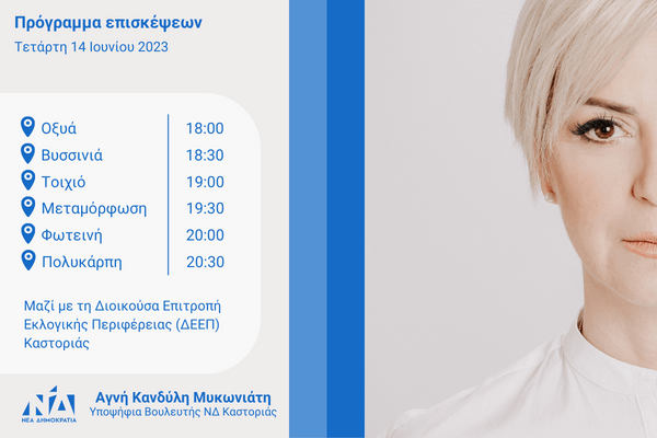 Το πρόγραμμα περιοδειών της Υπ. Βουλευτού ΝΔ Καστοριάς κα. Αγνής Κανδύλη Μυκωνιάτη, από κοινού με την ΔΕΕΠ Καστοριάς στο πλαίσιο της προεκλογικής εκστρατείας κι ενόψει των εθνικών εκλογών της 25ης Ιουνίου.