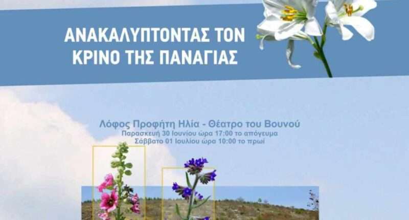 Στο πλαίσιο του διήμερου προγράμματος δράσεων για την ανάδειξη του Κρίνου της Παναγιάς, θα διεξαχθεί το Σάββατο 01 Ιουλίου 2023, αγώνας δρόμου με τίτλο: «Ο δρόμος του Κρίνου της Παναγιάς» στον Λόφο του Προφήτη Ηλία.