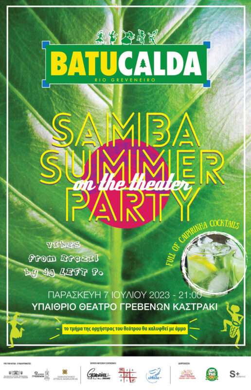 Την Παρασκευή 7 Ιουλίου το Υπαίθριο Θέατρο Καστράκι θα μετατραπεί σε παραλία της Bahia και του Rio Greveneiro καθώς θα επικαλυφθεί η έκταση της ορχήστρας του θεάτρου με άμμο. Στις 21.00 θα παρουσιάσουν ρυθμούς ξεχωριστά κάθε μπάντα σε μια συναυλία σταθμό και θα ακολουθήσει ένα υπέροχο Samba Summer Party όπου η caipirinha (κοκτέϊλ βραζιλιάνικο) θα ρέει άφθονη!!!