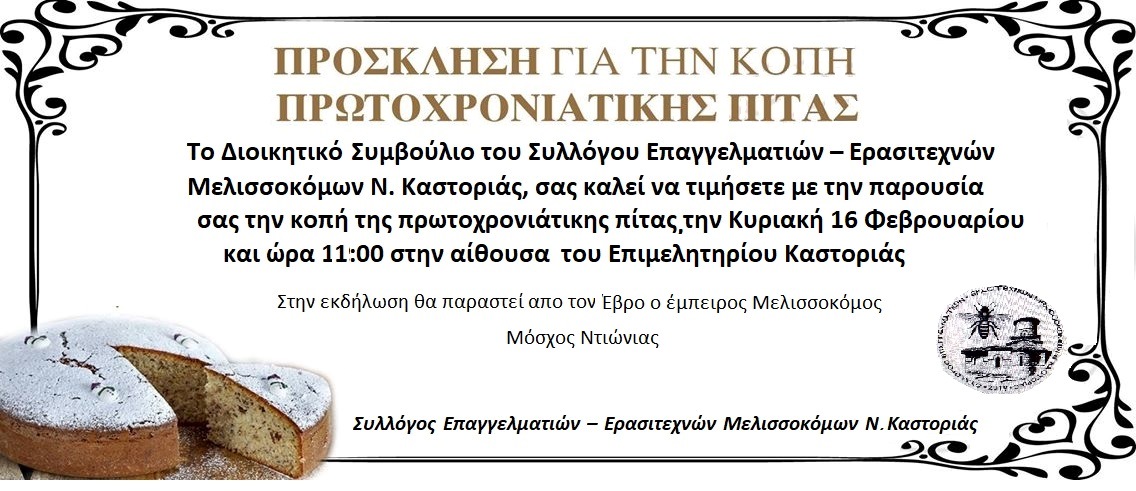 «Κλείνοντας θα ήθελα να ευχαριστήσω εκ βάθους καρδίας την Εφημερίδα “Ορίζοντες” γιατί ήσασταν δίπλα στον Σύλλογό μας από τα πρώτα του βήματα και δεν μπορώ να το ξεχάσω αυτό», κατέληξε ο κ. Καραταγλίδης και απηύθυνε κάλεσμα προς όλους τους πολίτες να παρευρεθούν στην ετήσια γιορτή για την Κοπή της Βασιλόπιτας του Συλλόγου, η οποία θα πραγματοποιηθεί την Κυριακή 16 Φεβρουαρίου 2020, στις 11:00 π.μ. στην αίθουσα του Επιμελητηρίου Καστοριάς. Στην εκδήλωση θα παραστεί ο έμπειρος Μελισσοκόμος Μόσχος Ντιώνιας, όπου και θα πραγματοποιήσει μια πολύ ενδιαφέρουσα ομιλία.