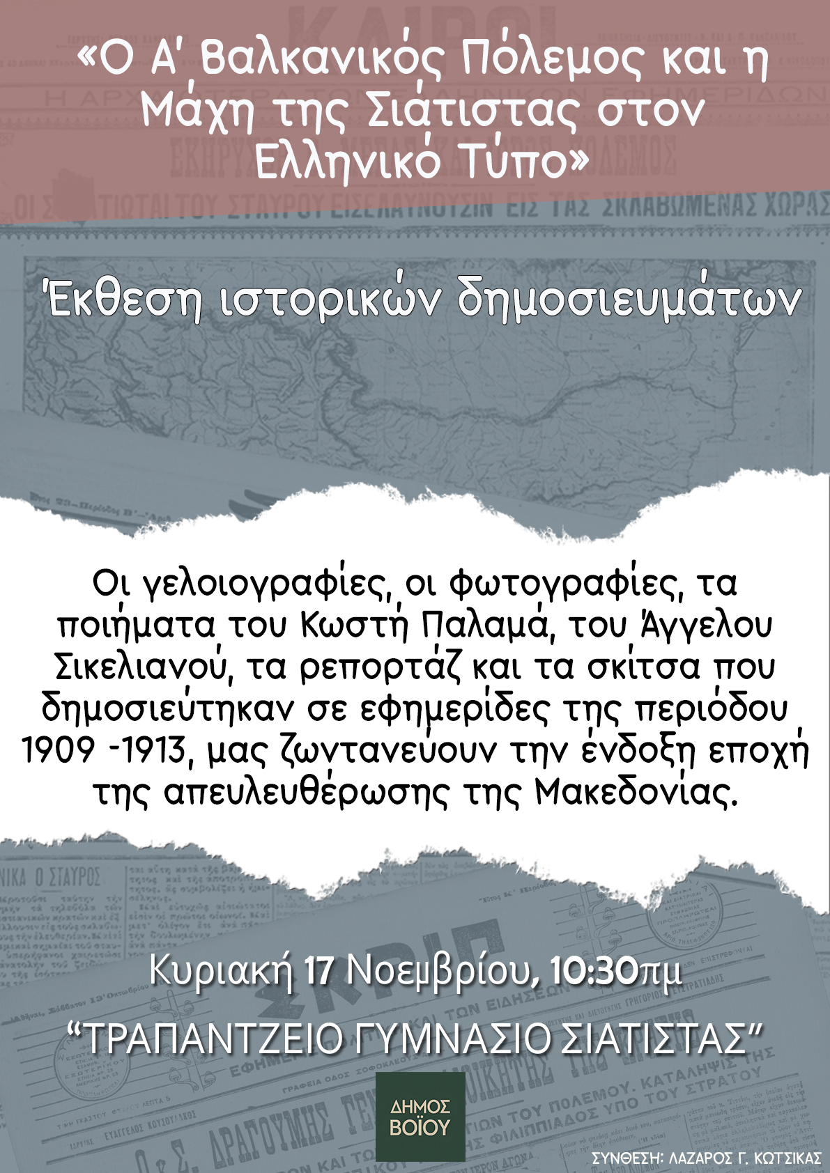 Την Κυριακή 17 Νοεμβρίου 2024, η έκθεση ιστορικών δημοσιευμάτων με τίτλο «Ο Α’ ΒΑΛΚΑΝΙΚΟΣ ΠΟΛΕΜΟΣ ΚΑΙ Η ΜΑΧΗ ΤΗΣ 4ης ΝΟΕΜΒΡΙΟΥ ΣΤΟΝ ΕΛΛΗΝΙΚΟ ΤΥΠΟ» ανοίγει τις πόρτες της, στις 10:30π.μ., στο Τραμπάντζειο Γυμνάσιο Σιάτιστας. Η έκθεση πρωτοπαρουσιάστηκε στην επετειακή εκδήλωση «ΣΙΑΤΙΣΤΑ: Κέντρο Ελευθερίας και Πολιτισμού», που έγινε στο Πολιτιστικό Κέντρο «Άρης & Λίλιαν Βουδούρη», την Κυριακή 3 Νοεμβρίου 2024.