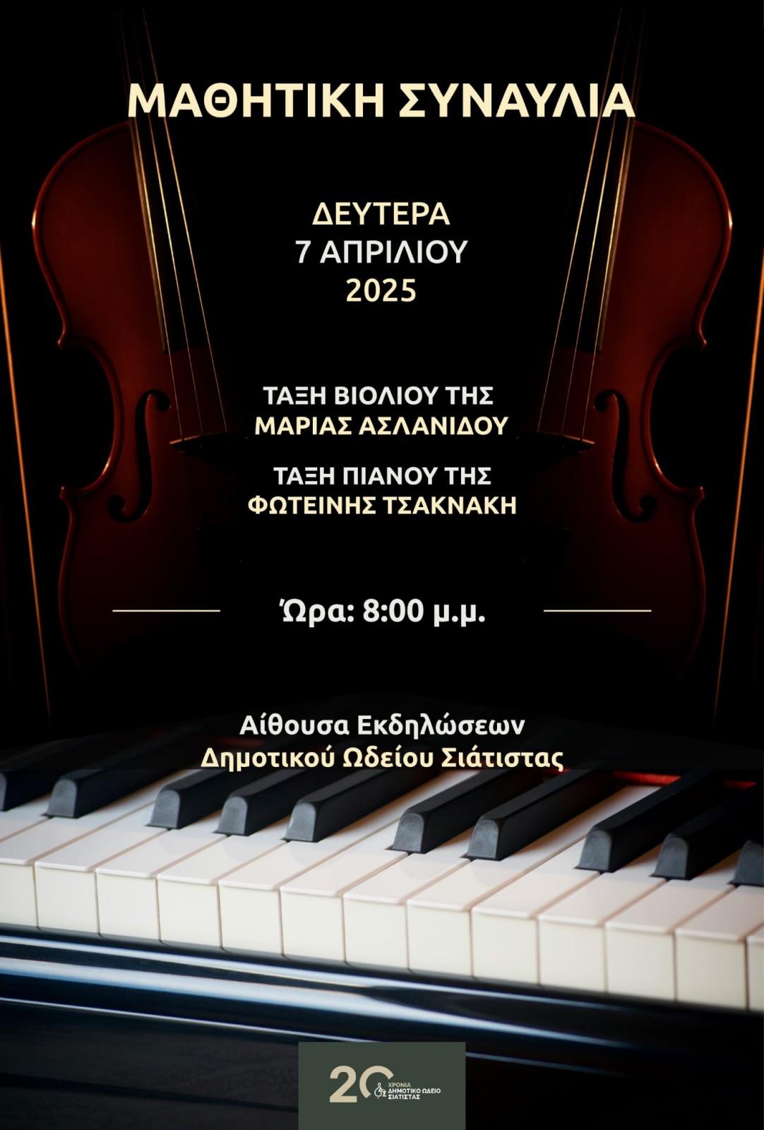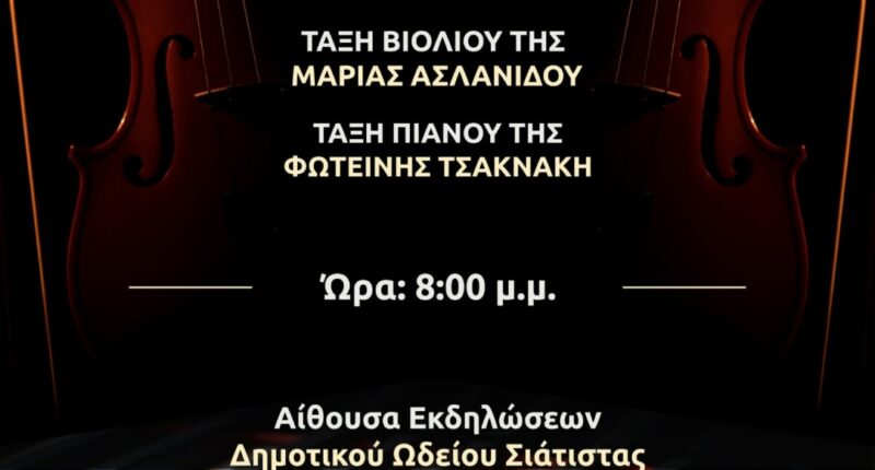 Μαθητική Συναυλία της τάξης Βιολιού της Μαρίας Ασλανίδου και Πιάνου της Φωτεινής Τσακνάκη θα πραγματοποιήσει το Δημοτικό Ωδείο Σιάτιστας τη Δευτέρα 7 Απριλίου στις 8:00 μ.μ. στην αίθουσα εκδηλώσεων του ωδείου.
