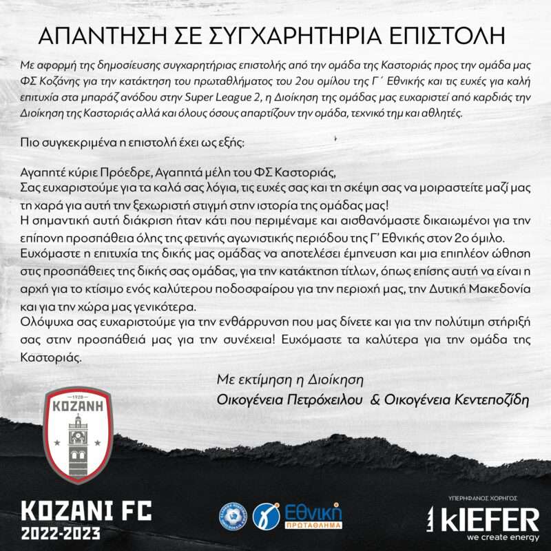 Με αφορμή της δημοσίευσης συγχαρητήριας επιστολής από την ομάδα της Καστοριάς προς την ομάδα μας ΦΣ Κοζάνης για την κατάκτηση του πρωταθλήματος του 2ου ομίλου της Γ΄ Εθνικής και τις ευχές για καλή επιτυχία στα μπαράζ ανόδου στην Super League 2, η Διοίκηση της ομάδας μας ευχαριστεί από καρδιάς την Διοίκηση της Καστοριάς αλλά και όλους όσους απαρτίζουν την ομάδα, τεχνικό τημ και αθλητές.