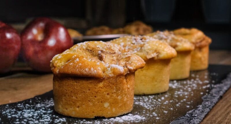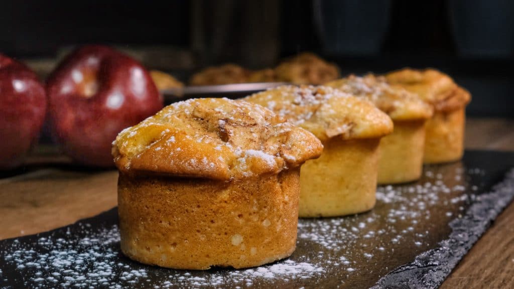 Σε κάθε θήκη βάζουμε το μείγμα και από πάνω πασπαλίζουμε με τα ψιλοκομμένα κομματάκια μήλου.
