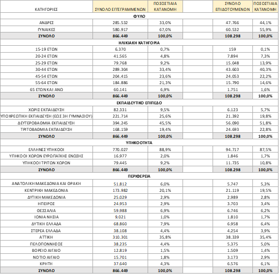 ΠΙΝΑΚΑΣ 1: ΣΥΝΟΛΟ ΕΓΓΕΓΡΑΜΜΕΝΩΝ ΚΑΙ ΕΠΙΔΟΤΟΥΜΕΝΩΝ ΚΑΤΑ ΦΥΛΟ, ΗΛΙΚΙΑΚΗ ΚΑΤΗΓΟΡΙΑ, ΕΚΠΑΙΔΕΥΤΙΚΟ ΕΠΙΠΕΔΟ, ΥΠΗΚΟΟΤΗΤΑ ΚΑΙ ΠΕΡΙΦΕΡΕΙΑ