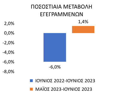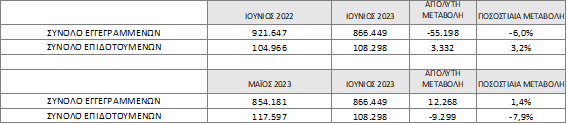 Το σύνολο των εγγεγραμμένων για τον μήνα Ιούνιο 2023 ανήλθε σε 866.449 άτομα καταγράφοντας μείωση κατά -55.198 άτομα (-6,0%) σε σχέση με τον αντίστοιχο μήνα του προηγούμενου έτους Ιούνιο 2022 και αύξηση κατά 12.268 άτομα (1,4%) σε σχέση με τον προηγούμενο μήνα Μάϊο 2023.