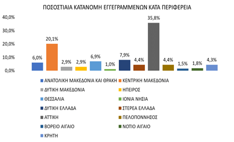 Μεταξύ των Περιφερειών της Χώρας η Περιφέρεια Αττικής και η Περιφέρεια Κεντρικής Μακεδονίας καταγράφουν τον μεγαλύτερο αριθμό εγγεγραμμένων ο οποίος ανέρχεται σε 310.301 άτομα (ποσοστό 35,8%) και 173.982 άτομα (ποσοστό 20,1%) αντίστοιχα.