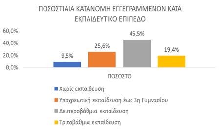 - Το εκπαιδευτικό επίπεδο Δευτεροβάθμιας[1] εκπαίδευσης συγκεντρώνει τον μεγαλύτερο αριθμό εγγεγραμμένων μεταξύ των εκπαιδευτικών επιπέδων ο οποίος ανέρχεται σε 394.245 άτομα (ποσοστό 45,5%).