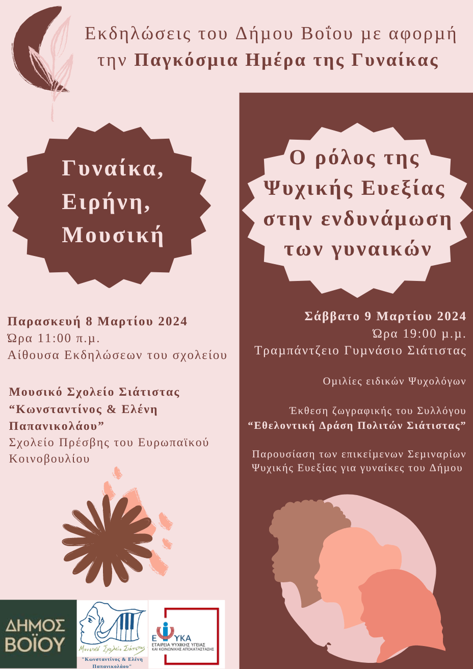Ο Δήμος Βοΐου, με αφορμή την Παγκόσμια Ημέρα της Γυναίκας (8 Μαρτίου), διοργανώνει τις εξής εκδηλώσεις: