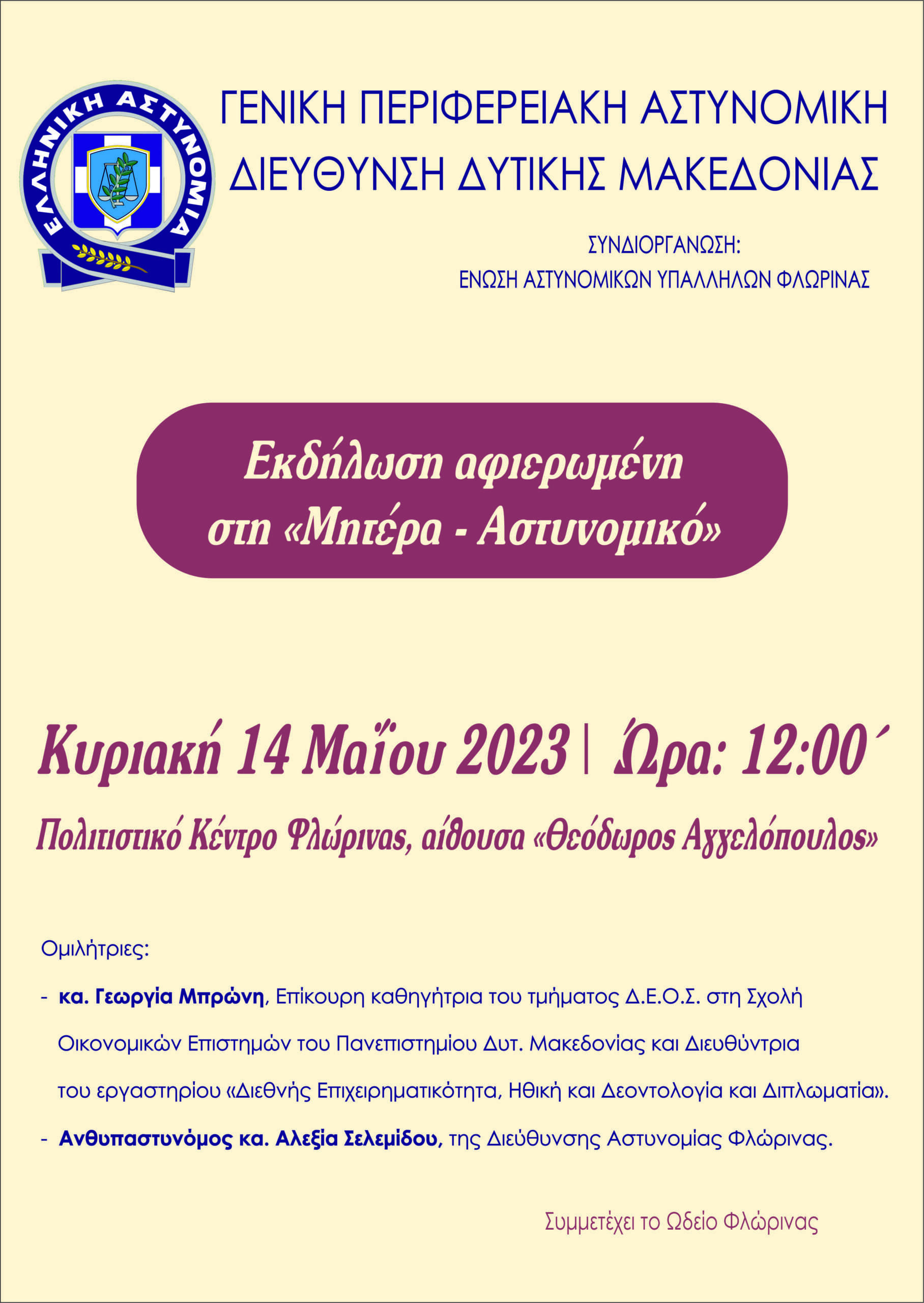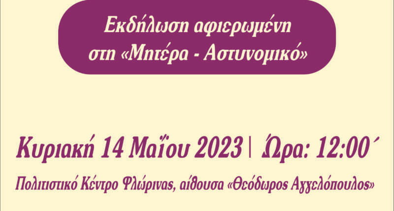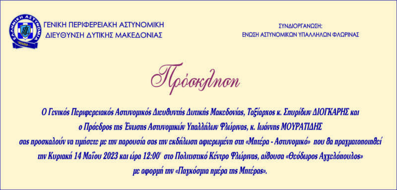 Η Γενική Περιφερειακή Αστυνομική Διεύθυνση Δυτικής Μακεδονίας από κοινού με την Ένωση Αστυνομικών Υπαλλήλων Φλώρινας, την Κυριακή 14 Μαΐου 2023 και ώρα 12:00, στο Πολιτιστικό Κέντρο Φλώρινας, στην αίθουσα «Θεόδωρος Αγγελόπουλος», στη Φλώρινα διοργανώνει εκδήλωση με αφορμή τη Γιορτή της Μητέρας, για να τιμηθεί η «Μητέρα-Αστυνομικός».