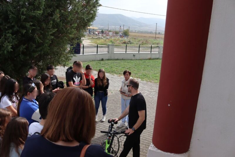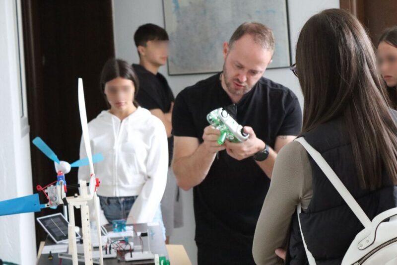 Μετά την παρουσίαση/εισαγωγή, ακολούθησε περιήγηση στον εκθεσιακό χώρο του Κέντρου από τον youth worker του Κέντρου, Λάζαρο Παπουτζή, όπου οι μαθητές/τριες είχαν την ευκαιρία να ανακαλύψουν πρότυπες εφαρμογές των ΑΠΕ, προσομοιώσεις εφαρμογών πράσινου υδρογόνου, ολοκληρωμένα συστήματα οικιακών φωτοβολταϊκών και ανεμογεννητριών, μπαταριών, εκπαιδευτικά ρομπότ τεχνητής νοημοσύνης, σταθμών φόρτισης και ηλεκτροκίνησης.