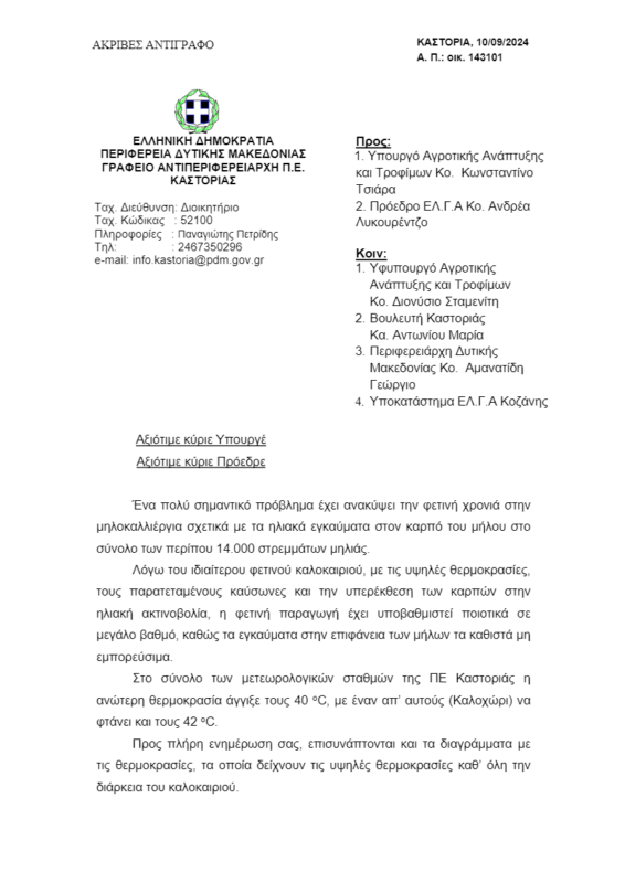 Επιστολή για ένα πολύ σημαντικό πρόβλημα που έχει ανακύψει την φετινή χρονιά στην μηλοκαλλιέργια σχετικά με τα ηλιακά εγκαύματα στον καρπό του μήλου στο σύνολο των περίπου 14.000 στρεμμάτων μηλιάς, έστειλε ο Αντιπεριφερειάρχης Καστοριάς Δημήτρης Σαββόπουλος, σήμερα Τρίτη 10 Σεπτεμβρίου 2024, προς τον Υπουργό Αγροτικής Ανάπτυξης και Τροφίμων Κο. Κωνσταντίνο Τσιάρα και τον πρόεδρο του ΕΛ.Γ.Α Κο. Ανδρέα Λυκουρέντζο κοινοποιώντας τη στον Υφυπουργό Αγροτικής Ανάπτυξης και Τροφίμων Κο. Διονύσιο Σταμενίτη, στην Βουλευτή Καστοριάς Κα. Αντωνίου Μαρία, στον Περιφερειάρχη Δυτικής Μακεδονίας Κο. Αμανατίδη Γεώργιο και στο Υποκατάστημα ΕΛ.Γ.Α Κοζάνης.