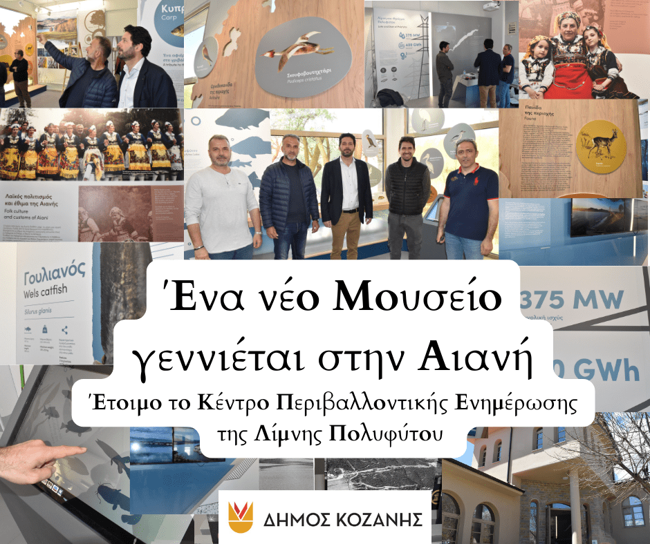 Ολοκληρώνονται σήμερα Παρασκευή 5 Απριλίου 2024, οι εργασίες υλοποίησης του Κέντρου Περιβαλλοντικής Ενημέρωσης της Λίμνης Πολυφύτου, το οποίο εδρεύει στην Αιανή του Δήμου Κοζάνης, αναδεικνύοντας μέσω της σύγχρονης τεχνολογίας, το ανεξάντλητο πολιτισμικό απόθεμα και το δυναμικό οικοσύστημα της πανέμορφης παραλίμνιας περιοχής του Δήμου μας.