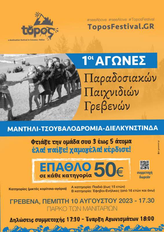 Για πρώτη φορά αναβιώνουμε παραδοσιακά παιχνίδια των Γρεβενών σε μορφή αγώνων. Θα έχετε την ευκαιρία να παίξετε, να γελάσετε και να μάθετε την απλότητα των τοπικών παιχνιδιών που για πολλά χρόνια μεγάλωσαν γενιές και γενιές. Οι αγώνες περιλαμβάνουν των διαγωνισμό σε τρία παιχνίδια: Μαντήλι, Τσουβαλοδρομίες, Διελκυνστίνδα. Μπορείτε να δημιουργήσετε ομάδες των 3 ή 5 ατόμων και να λάβετε συμμετοχή, καθώς θα είναι ομαδικά. Για συμμετοχές και περισσότερες πληροφορίες απευθυνθείτε στο 2462501198 ή στο [email protected]
