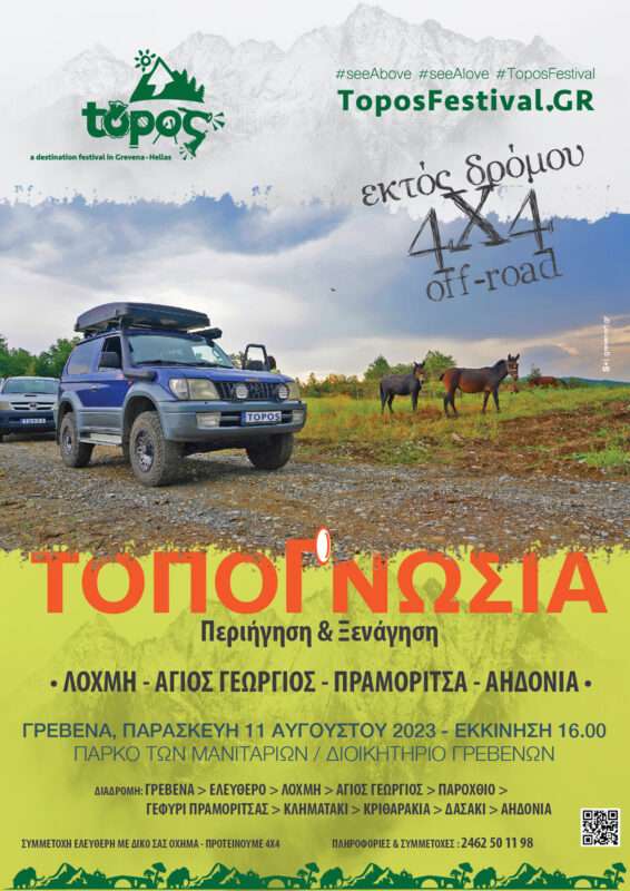 Αναδεικνύοντας την μοναδικότητα της φυσικής και πολιτιστικής έκτασης του τόπου μας των Γρεβενών, για δεύτερη συνεχόμενη χρονιά στο φεστιβάλ μας εντάσσουμε την διοργάνωση της Τοπογνωσίας. Διάσχιση και περιήγηση από μοναδικούς δρόμους, παλιούς ξεχασμένους, σε σημεία που πλέον δεν γνωρίζουν πολλοί με τοπικούς ξεναγούς.