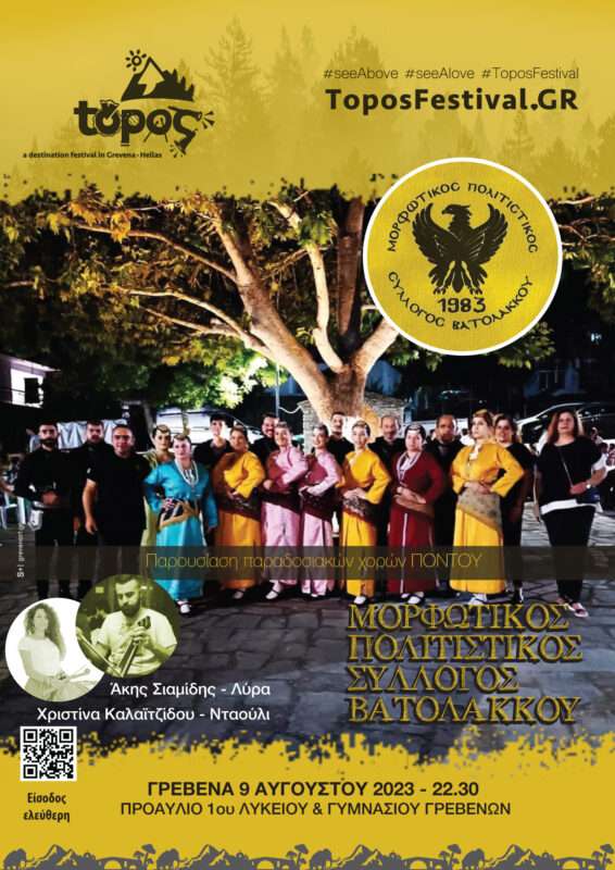 22.30 μ.μ. – 23.30 μ.μ. Χοροί και τραγούδια του Πόντου. Παρουσίαση χορών του Πόντου, από τον εξαίρετο Μορφωτικό Πολιτιστικό Σύλλογο Βατολάκκου. Συνοδεύουν μουσικά στην ποντιακή λύρα ο Άκης Σιαμίδης και στο νταούλι η Χριστίνα Καλαϊτζίδου.