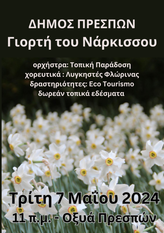Ο Δήμος Πρεσπών υποδέχεται την άνοιξη με τη “Γιορτή του Νάρκισσου”, την Τρίτη 7 Μαΐου 2024, στις 11:00 το πρωί, στην Οξυά, δίπλα στο λιβάδι με τους νάρκισσους. Γιορτάζουμε με χάλκινα πνευστά, με την ορχήστρα “Τοπική Παράδοση” και χορούς από τους “Λυγκηστές Φλώρινας” και τους μαθητές από το χορευτικό συγκρότημα του Συλλόγου Γονέων και Κηδεμόνων Νηπιαγωγείου – Δημοτικού Αγίου Γερμανού. Απολαμβάνουμε τοπικές λιχουδιές, που προσφέρουν επιχειρηματίες της περιοχής και βεβαίως, θαυμάζουμε και φωτογραφίζουμε τους νάρκισσους, χωρίς να τους καταστρέφουμε.