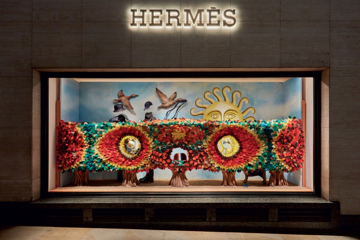 Η δεύτερη συνεργασία του με τον ιστορικό οίκο ήταν τον φετινό Σεπτέμβριο, για την μπουτίκ στο Λονδίνο αυτή τη φορά. Ο Μπάλντοκ οραματίστηκε μια βιτρίνα που θα λειτουργούσε σαν πύλη στον φανταστικό κόσμο. Η εγκατάσταση με τίτλο «Take a Peek» αναπαριστά έναν παριζιάνικο κήπο με εκατοντάδες φύλλα στις αποχρώσεις του φθινοπώρου. «Η κλειδαρότρυπα είναι ένα στοιχείο που εμφανίζεται συχνά στα έργα μου. Προκαλεί περιέργεια και καλεί τον θεατή να κοιτάξει μέσα δημιουργώντας μια αλληλεπίδραση σώματος και πνεύματος», εξηγεί. Ο Μπάλντοκ προσέγγισε αυτή τη συνεργασία ως μια ευκαιρία να παρουσιάσει τη γλυπτική του σε ένα ευρύτερο κοινό, πέρα από τα όρια μιας γκαλερί. «Για μένα, η γλυπτική βασίζεται στη φυσική παρουσία του θεατή. Υπάρχει πάντα ένα στοιχείο παράστασης και αυτό ήταν το στοίχημά μου για τη λονδρέζικη βιτρίνα της Hermès: πώς μπορώ να εμπλέξω τους περαστικούς;», λέει. Η βιτρίνα του, που θα διατηρηθεί μέχρι την 1η Νοεμβρίου, έχει σκοπό να παροτρύνει τον κόσμο να σταματήσει, να κοιτάξει και να αλληλεπιδράσει με τα εκθέματα, σπάζοντας τη μονοτονία της καθημερινής βόλτας. Σε αντίθεση με τα έργα που παρουσιάζει σε έναν χώρο τέχνης, η δημιουργία μιας βιτρίνας εμπορικού καταστήματος απαιτεί διαφορετική προσέγγιση. «Δεν είχα την ελευθερία που έχω σε μια γκαλερί, καθώς έπρεπε να λάβω υπόψη τα προϊόντα και να δουλέψω σε έναν περιορισμένο χώρο, ορατό μόνο πίσω από γυαλί». Παρά τις προκλήσεις, κατάφερε να διατηρήσει την καλλιτεχνική του αυθεντικότητα. Ακόμα και τα δερμάτινα φύλλα που διακοσμούν τη βιτρίνα υπογραμμίζουν την προσήλωσή του στη βιωσιμότητα. «Οταν η βιτρίνα αποσυναρμολογηθεί, αυτά τα φύλλα θα μετατραπούν σε μπρελόκ», λέει με περηφάνια.