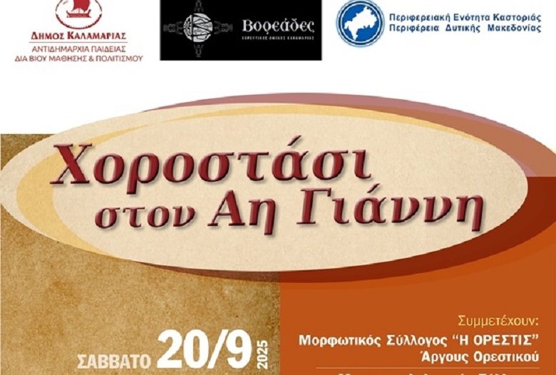 Η Περιφερειακή Ενότητα Καστοριάς, ο Χορευτικός Όμιλος Καλαμαριάς «Βορεάδες» και ο Δήμος Καλαμαριάς συνδιοργανώνουν την εκδήλωση «Χοροστάσι στον Αη Γιάννη» το Σάββατο 20 Σεπτεμβρίου 2025, το απόγευμα, στον αύλειο χώρο του 10ου Δημοτικού Σχολείου Καλαμαριάς.