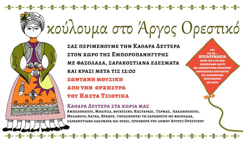 Τα Κούλουμα θα γιορτάσουν και εννιά χωριά του Δήμου Άργους Ορεστικού, για όσους θέλουν να συνδυάσουν την Καθαρά Δευτέρα με μια εξόρμηση στη φύση. Εκδηλώσεις θα πραγματοποιηθούν σε Αμπελόκηπους, Μηλίτσα, Κωσταράζι, Βογατσικό, Γέρμα, Λαχανόκηπους, Μελάνθιο, Λάγκα και Βράχο, με παραδοσιακή φασολάδα, σαρακοστιανά εδέσματα και κρασί, προσφορά του Δήμου Άργους Ορεστικού. Αναλυτικά: