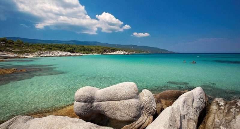 Τα νερά είναι διάφανα τυρκουάζ, η άμμος άσπρη και τα πεύκα φθάνουν ως το ακρογιάλι. Η ομορφιά της φύσης είναι τέτοια που σου κόβει την ανάσα.